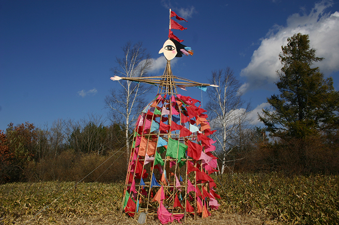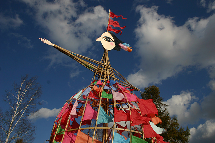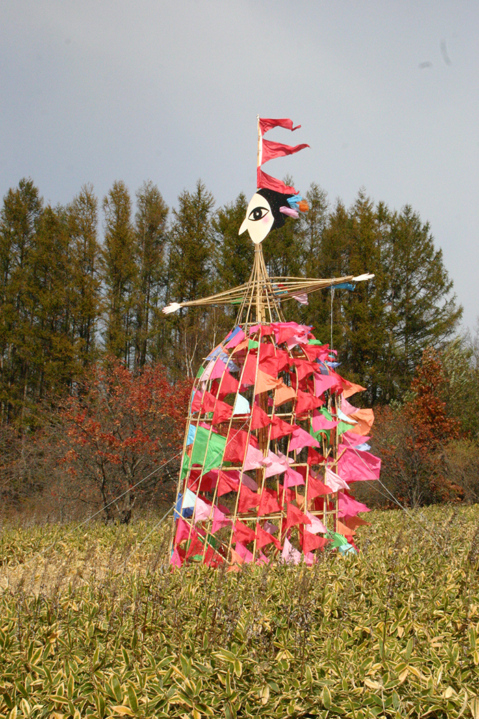 樹木が繁茂する野外空間のなかに、スケール感をともなったヒトの形(女性)を構築 また、自然の風土と対峙してきた十勝の人々の力強さを象徴させる作品とする。 十勝野の風を受けて、スカートに無数にまとわせたビビッドな色彩の小布がはため