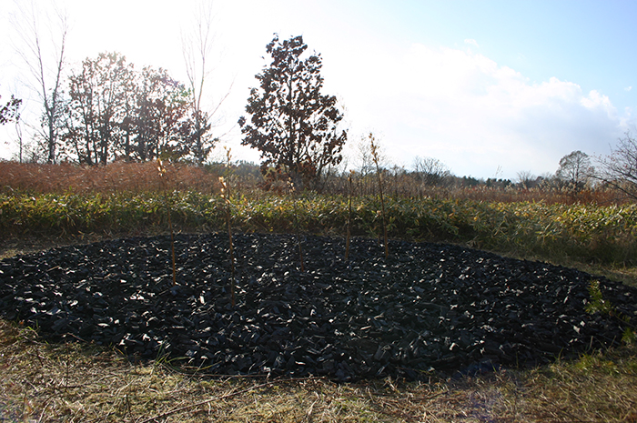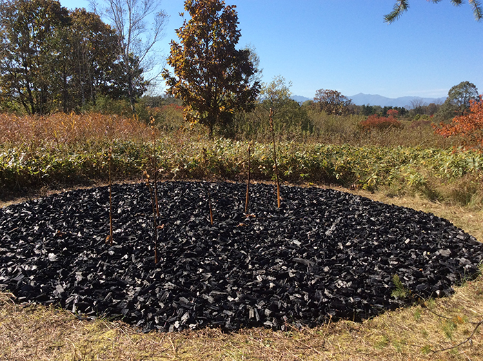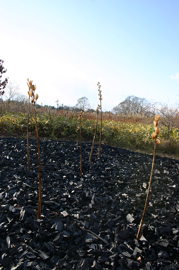 「楽園の再生」制作年=2016 素材:オオウバユリ・炭・他 協力:有限会社 本郷林業