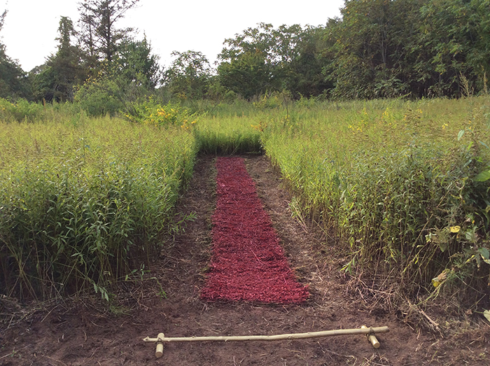 「赤絨毯」Red Carpet制作年=2016 素材:オオタカアワダチソウ、麻縄、ヤマナラシ、塗料