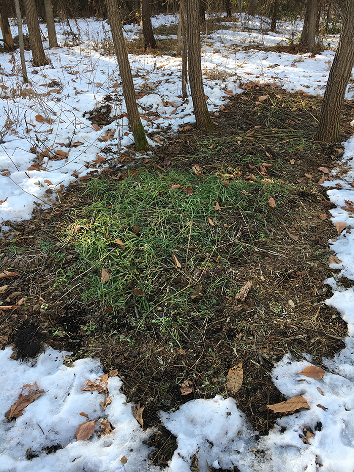 11月13日 雪化粧の中、そこだけ緑の地が現れました。 置いたものに絡み、色を包みながら。