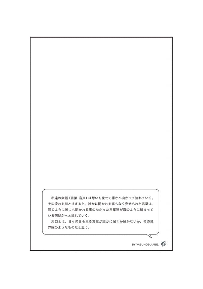 私達の会話(言葉・音声)は想いを乗せて誰かへ向かって流れていく。 その流れを川と捉えると、誰かに聞かれる事もなく発せられた言葉は、 同じように誰にも聞かれる事のなかった言葉達が海のように留まっている何処かへと流れていく。 河口とは、日々発せられる言葉が誰かに届くか届かないか、その境界線のようなものだと思う。
