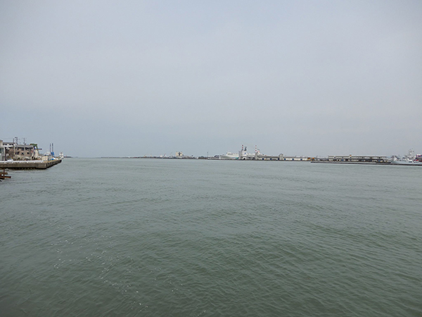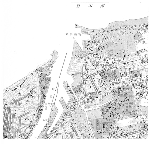 日本一長いといわれる信濃川の河口を 地形図をもとに水(川と海)を黒、陸地を鏡面として分割。 |