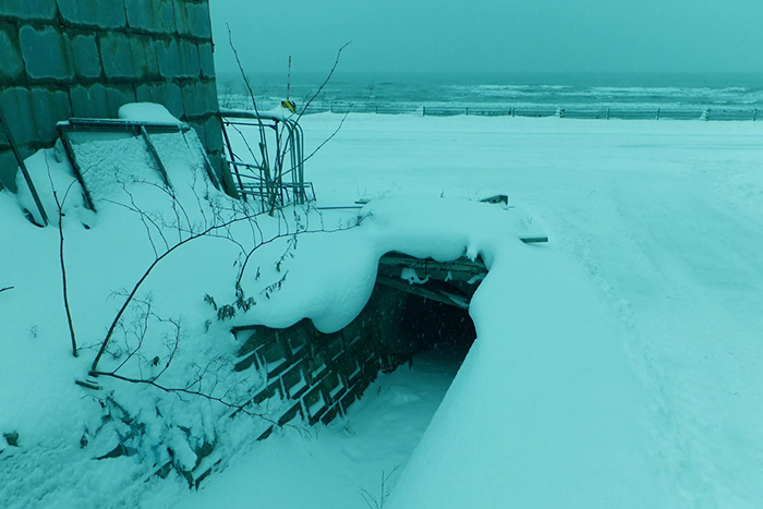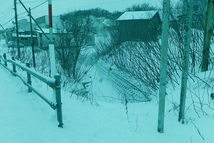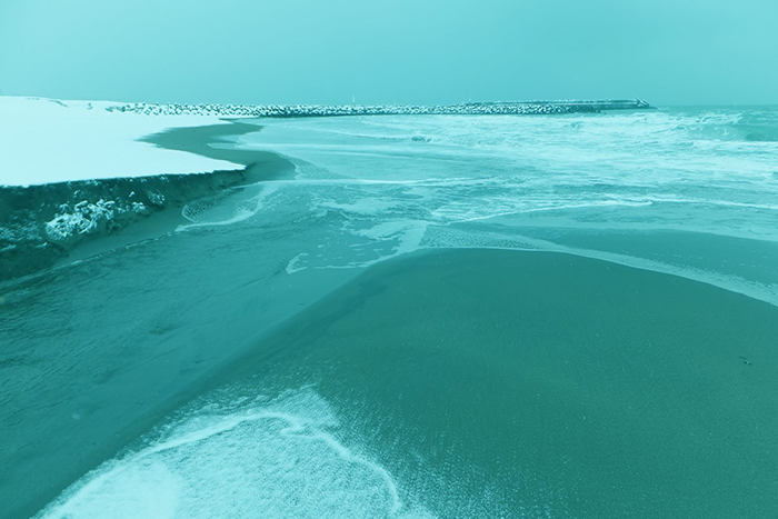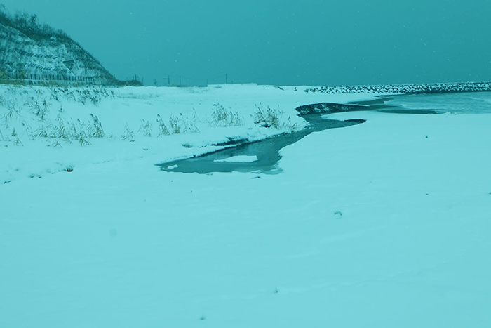 海岸に降りてみると雪の下に水が流れているのが見えた。