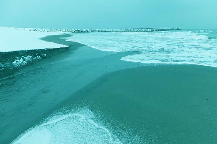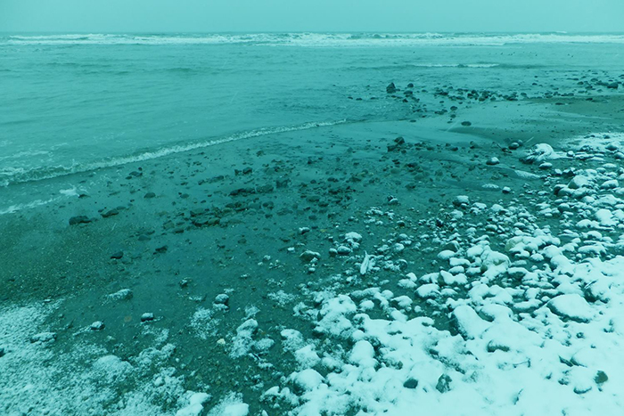 波の音を聞きながら,波が足元に迫るのを感じながら,川の水と海水と雪が混ざり合う様子を見ていた。
