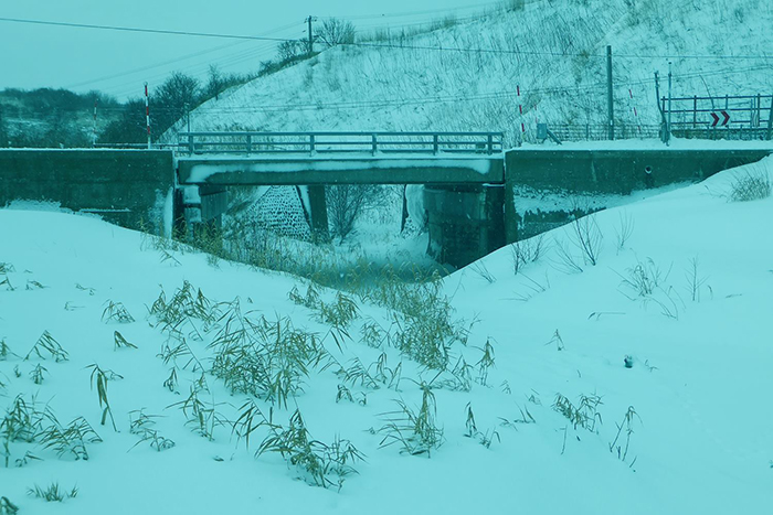 その小さな鉄橋や国道の下を流れる川。雪が積もっていて,水の流れは確認できなかった。