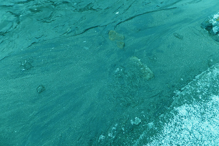 川尻の底を見ると,グレーの砂と黒い砂が流れながら模様をつくっていた。