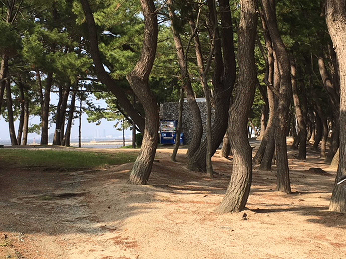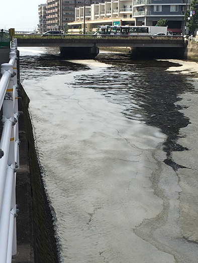 6月中旬、福岡に滞在中の一日、夫が子供だった頃、家から海水パンツを履いて近くの海まで行ったという河口沿いの道を歩いた。川は、満潮時の赤潮が海から上がってきていて、川の深い緑色の水に赤潮が溶け込んで血のような鈍色にうねっていた。波立ってできる白濁色の泡が有機物の帯のようになって、川の中にもう一筋の川ができている。