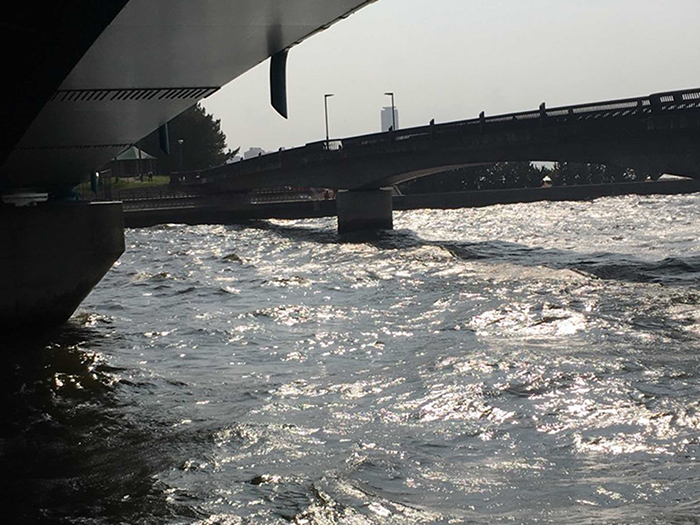 川を横断する橋が何重にも渡されている。 川沿いの道は所々突然コンクリートでふさがれ行き止まりになっていて、その先に行くには、川の上にかけられた道路を横断しなければならない。川の水だけはそのまま流れて行けても、人は人の作った規則に従って横断する道路に上がり信号待ちをする。然も信号機のある横断歩道は川のどちらか一方にしかなく川沿いの道を歩くには右岸へ、左岸へと遠回りすることを強いられる。 急にたっぷりの波が激しく打ち寄せて盛り上がり砕けているひときわ大きな橋桁のある橋をくぐると突然視界が開け眼前に海が広がっている。国道と高速道路が海に突き出すようにかかっていて、その最後の橋桁が川の河口だった。
