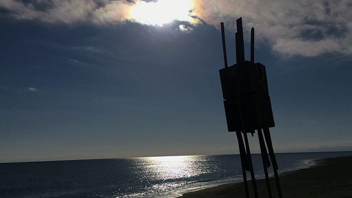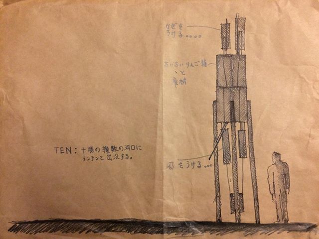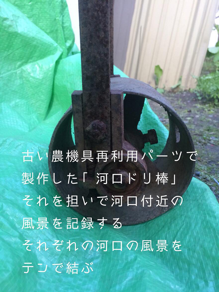 十勝の複数の河口を 古い錆びた農機具パーツのロッドとローラーを再利用した河口を撮る為の自撮り棒 「河口ドリ棒」を使って3.7M俯瞰した記録をTENに記録する。 TENに記録したイメージをもとに 河口に表現するTENのイメージを創る