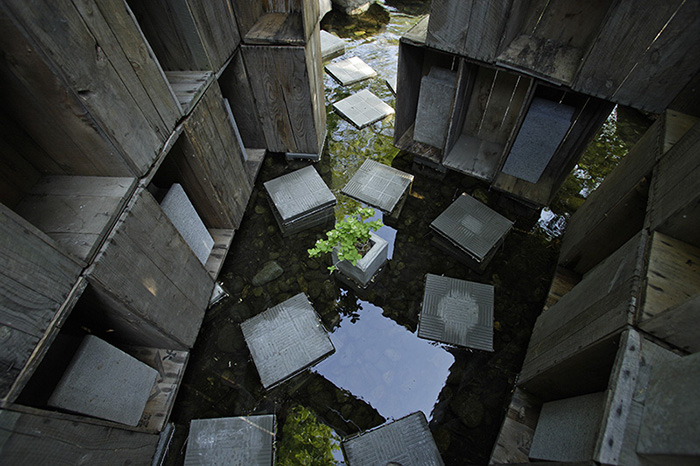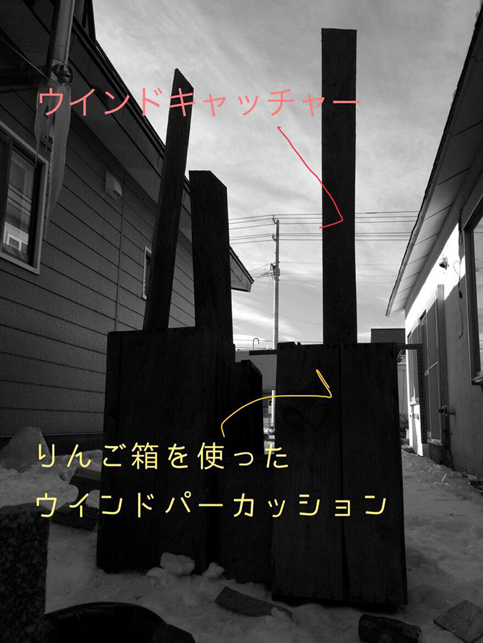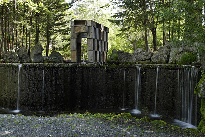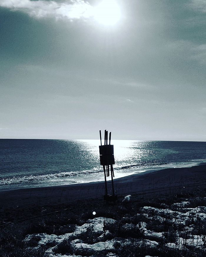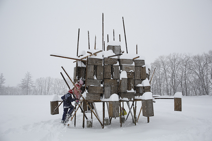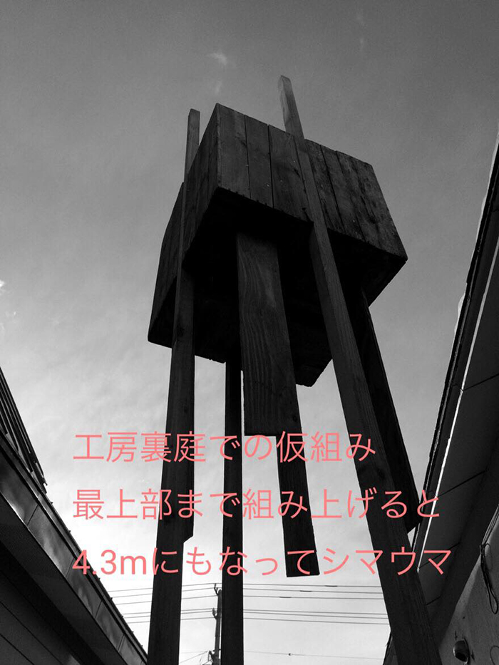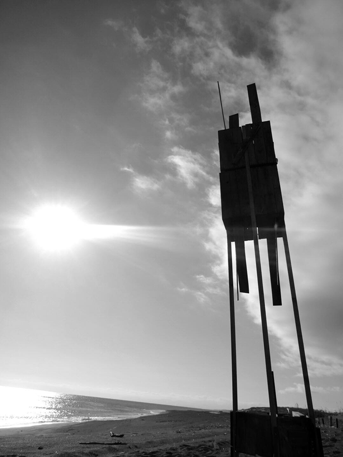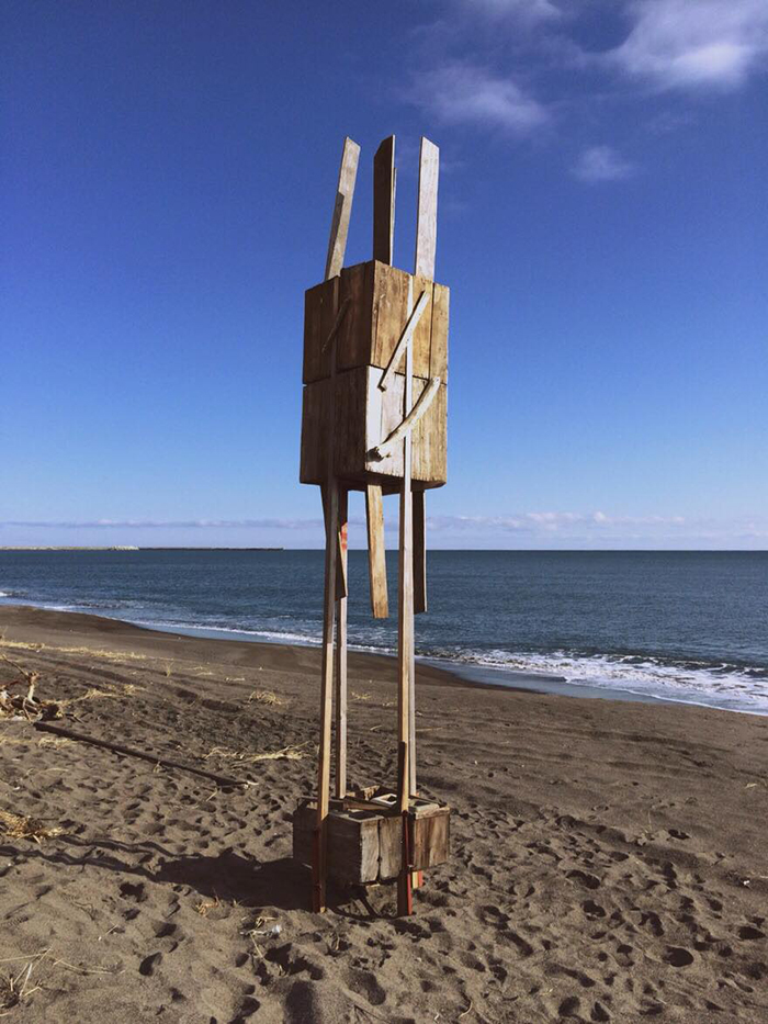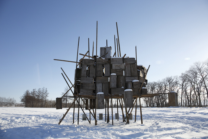 「 TEN」制作年 : 2018 素材 : 古い古いりんご箱 建築廃材 大きさ : W1.07m×D1.07m×H4.1m 作品展示場所 : 長節湖河口その他 作品設置予定日 : 2018 12/28~31